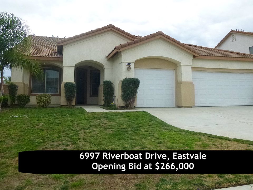 HOT NEW LISTING IN EASTVALE! This HUBZU listing is a single-level 3 bedroom, 2 bath home with 3 car garage, formal living room - dining room, den or office and great open family room - kitchen. The opening bid for the property is $266,000 and bidding closes at 10:00PM (ET) on February 10, 2013. Featuring white tile counters, the kitchen has light wood finish, built in oven, four burner cooktop and dishwasher. All appliances are Whirlpool. The master retreat features a soaking tub, separate shower and large walk-in closet. The home has an inside laundry room with cabinet storage. Listing is courtesy of David Judd of REALHome Services and Solutions, Inc.. The Buyer Referral Agent is Michael J. O'Connor - 951-847-4883 (cell) or RealtorOConnor@aol.com.
