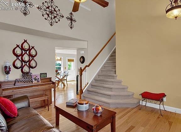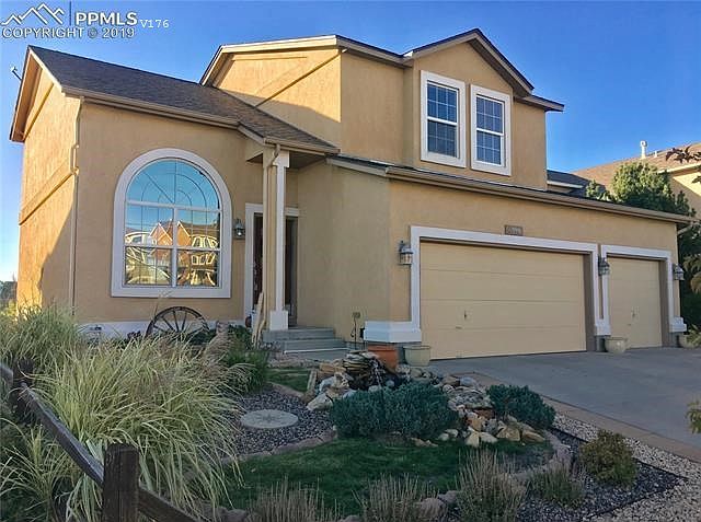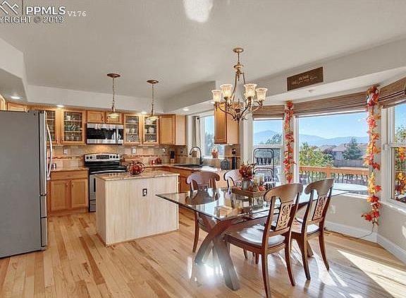Here is a incredible home with amazing Pikes Peak views located minutes away from schools, parks, and shopping. Throughout the main level you will find beautiful hickory floors. The kitchen is open in design and includes granite counter tops, decorative tile back splash, stainless steel appliances, a functional island, pendant lights, modern can lighting, glass faced cabinetry, and is the perfect place to gather and entertain. Walk out from the living room to a spacious deck and enjoy unobstructed views of the mountains. The living room and dining room are open to the kitchen. There is a cozy gas fireplace in the living room with tile surround and hearth. On the upper level there are 3 bedrooms to include a generously sized master bedroom. The master bedroom and has a gas fireplace, a private attached bathroom with double sinks, a walk in closet, views from all the windows, and will accommodate the largest of furniture sets. In the basement there is a 4th bedroom, a 3/4 bathroom, and rec room that walks out to the back yard. The backyard landscaping is well kept in has a stamped concrete patio area with built in fire pit. You will find the lawn is lush, level, and is the provides the perfect place to jump and play. There is a storage shed on the side of the home so you can keep your lawn maintenance items out of your garage. This well kept home has mountain views from every window on the back side of the house. Whether you are in the dining room, the kitchen or the family room, Pikes Peak will be in the back drop. Relaxing on the deck is a great way to unwind, finish your day, and watch the sun set.