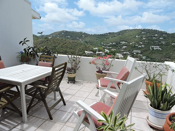 Mahogany Run top floor 2 bedroom, 2 bath with remodeled kitchen in stand-alone building (ie no adjoining neighbors to the side). Tiled steps lead from the carport to the unit and there are beautiful shrubs and fruit trees to the side. A panoramic view encompasses the golf course and St. John to the east, with cooling easterly breezes. Gated community with golf course, two pools and restaurant. Just a short drive to beautiful Magens beach and centrally located for easy access to town, the aiport or the east end.