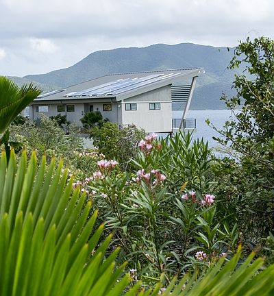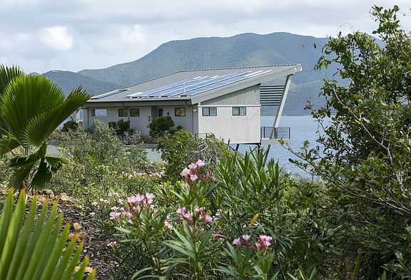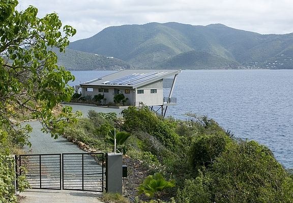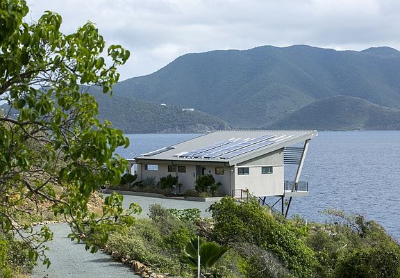 "Eco Haute" was built to take advantage of the most environmentally sound building techniques. From the recycled steel construction, the off the grid solar power and the gravel pave drive to the recycled waste water, the goal was self sufficiency without sacrificing comfort. It is hard to take your eyes off the island and ocean views that surround the "Haute". There is a king master bedroom and a small "yoga" room with a Murphy bed. The sunny great room has comfortable furnishings and Dish Network TV. The fully equipped galley style kitchen features stainless steel appliances and quartz counter tops. Each room has high ceilings with ceiling fans in the event natural breezes are light, and each opens onto to spacious covered teak porches. Outside is the dining area, a pool with stunning area and a covered porch where you will spend most of your time lounging on the comfortable cushioned outdoor furniture.