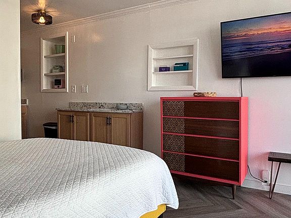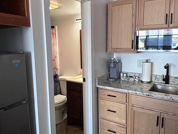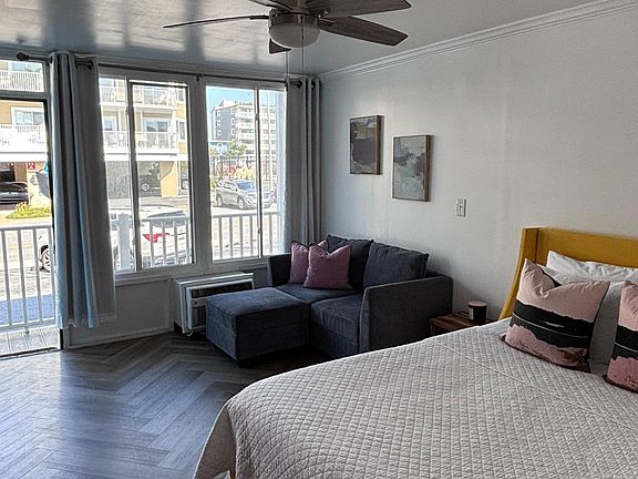 Discover the perfect beachside retreat in the heart of Midtown Ocean City, Maryland with this charming first-floor studio condo. Ideally situated just steps from the beach, you’ll enjoy direct access to the sand and surf without the hassle of a long walk. Location is what makes this property really shine; adjacent to the newly renovated Sea Loft Hotel and walking distance to Belly Busters, Seacrets, Aloft Bayfront Tiki Bar, Macky’s and more. This cozy studio has been recently updated to offer everything you need for a delightful coastal getaway. The space features new herringbone luxury vinyl planks and a stylish walk-in shower with contemporary black fittings. The well-equipped kitchenette boasts light wood cabinets, granite countertops, a stainless steel slim overhead microwave, a retro fridge, and essential small appliances, making meal preparation a breeze. The combined living and bedroom area includes a queen-sized bed, large closet, a small loveseat with storage, a through-the-wall AC and heat unit, a smart TV, and large sliding windows that fill the space with natural light. Convenience is key with a designated parking spot right out front, and the condo is easily accessible via a short flight of stairs or a handicap ramp on the first floor. Additionally, you’ll benefit from a storage locker in the back unit for all your beach gear. Recent building assessments ensure the property’s security and necessary updates, and low HOA fees reflect the new condo reserve study requirements. With a low cost of maintenance, upkeep, and utilities, this condo is an affordable investment for either a vacation home or a rental property. With 8 years of rental history and an average gross rental income of $25,000 per year, it offers an excellent opportunity to offset costs while enjoying the beachside lifestyle. Don’t miss out on owning this ideal coastal escape in Ocean City!
