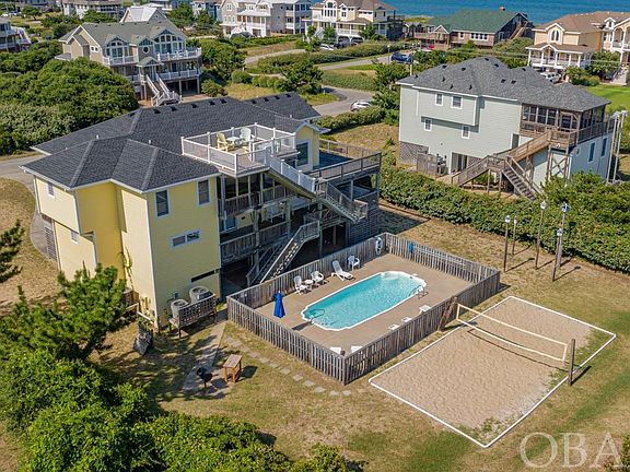 Escape to your dream coastal oasis on Seventh Avenue, just steps from the ocean in Southern Shores. This lovingly maintained 6-bedroom, 5-bathroom home offers the ultimate seaside sanctuary. With its private heated pool, relaxing hot tub, and even a volleyball court -- it's a paradise of your own by the beach. Inside, an open and spacious floor plan welcomes you, ideal for both family gatherings and entertaining friends. From hosting a beach vacation to creating cherished memories, this home effortlessly accommodates all your needs. The first level houses four private bedrooms, including two en-suites, ensuring comfort and privacy for everyone. An additional den and access to the covered deck with a hot tub overlooking the pool provide ample space to unwind. There is also an oceanside hammock for later afternoon naps after a long day in the sun. The top level is a true delight, showcasing expansive ocean views. Here, you'll find two more bedrooms, including a private en-suite, and a well-appointed kitchen with granite countertops and stainless steel appliances. Prepare an evening cocktail at the open wet bar and step onto the wrap-around deck, complete with a screened-in area for alfresco dining while enjoying the ocean breeze. For an even more awe-inspiring vista, ascend to the rooftop deck and immerse yourself in the coastal beauty. Southern Shores offers more than just stunning beaches. Take advantage of community beach accesses, playgrounds, and a serene soundside park. For a small additional fee, join the Southern Shores Civic Association and Boat Club with a marina and boat ramp, or the Tennis Club for additional activities. In today's market, homes like this are a rare gem. Seize the opportunity to embrace coastal living at its finest. Schedule your private tour today and transform this Southern Shores home into your own piece of paradise!!