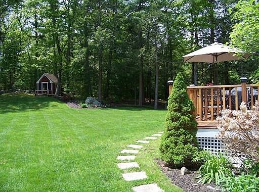 Custom built one owner colonial sited 500 feet from the curb on 4.6 acres at the end of a cul-de-sac. The first floor offers open concept living with hardwood throughout, 9 foot ceilings, a cherry/stainless/granite kitchen, and a private guest bedroom with full bath. In addition to a laundry room, the second floor has a spacious master suite with gas fireplace. There is a large full bath with double sinks and a private shower/toilet area for the other second floor rooms to share. The walk-up attic is ready for future expansion. Other amenities include: 28x12 mahogany deck, Andersen windows, 3 zone central air, central vacuum (including an automatic dustpan), on demand tankless hot water, recessed lights, ceiling fans in all bedrooms, a motorized chandelier, passive wine storage room in basement. 3 car garage. Enjoy this private setting within a friendly and desirable neighborhood. *Please note* Satellite images are several years old. There are no "eye sores" on neighboring lot.