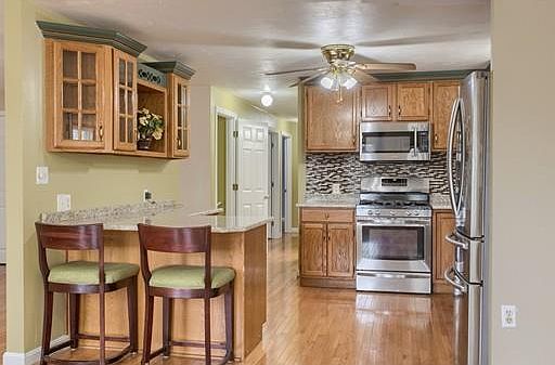 BOM Buyer was not able to get financing. Spacious, Young, Immaculate sprawling 3-5 bedroom, 3 Full bath ranch! Gorgeous master suite with wood floors, jacuzzi tub, vaulted ceiling, skylight ,walk-in closet, built in vanity and door to deck. Open floor plan, fully appliance cabinet-filled kitchen with peninsula and granite countertops, wood floors and sun drenched 4 season room! Finished walk-out lower level with office, guest room and 3rd full bath,double driveways, Central air private deck ,oversized shed and quick highway Access! Couple seasons old Snow blower and lower level refrigerator to stay with the property. Leased Solar panels.