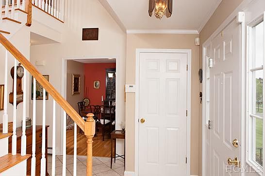 Spacious center hall colonial in desirable Highlands neighborhood with community pool and tennis. Newly installed central a/c and heat pump in 2015. Hardwood on lower level. Sunny and bright formal dining/living rooms eat in kitchen/family room. Brand new custom patio French doors to large deck. New carpet upstairs with newly updated California Closets walk-in in MB and updated master bath powder room and new appliances in kitchen. Freshly painted rooms. New roof 2005. Priced to sell! Finished storage space in basement - lots of extra room. Close to town train highway.