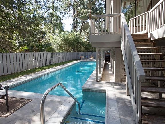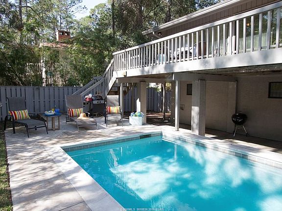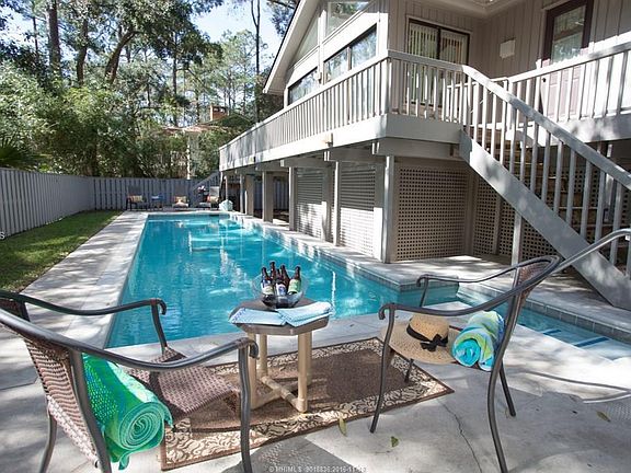 This is such a happy house, inside and out!!! You and your family will love the big, huge, wonderful pool this home has to offer!! Perfect for swimming laps or just sitting on the steps after your beach time!! Upstairs deck and balcony overlook the whole pool so Mom and Dad and friends can sit, sip and watch the kids swim!! Located 3rd row on the beachwalk to the best beach in all of Sea Pines!! Updated interior throughout with new Kitchen countertops, appliances, wet bar and tile flooring through kitchen, living and dining areas. New, large Master Bath with beautiful walk in shower!