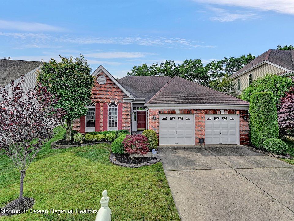 This beautiful Monaco Manor with a full brick front is waiting for you! The spacious kitchen features 42'' cabinets, stainless appliances, granite counters, a center island w/breakfast bar, pendant & recessed lights, and a breakfast room. Open floor plan from the kitchen to the family room and sun room. The Primary Bedroom has a tray ceiling, ceiling fan with light, huge walk-in closet, and ensuite bath w/shower stall, soaking tub, & vanity w/dual sinks. HW floors in foyer, hallway, family rm. Gas fireplace. Crown moldings. Attic storage above 2 car garage. Large paver patio w/sitting wall & electric awning backs to a lovely view of trees. Westlake amenities include Indoor & outdoor pools, clubhouse, fitness center, walking trails, tennis, bocce, 3 restaurants, 18-hole golf course & more.