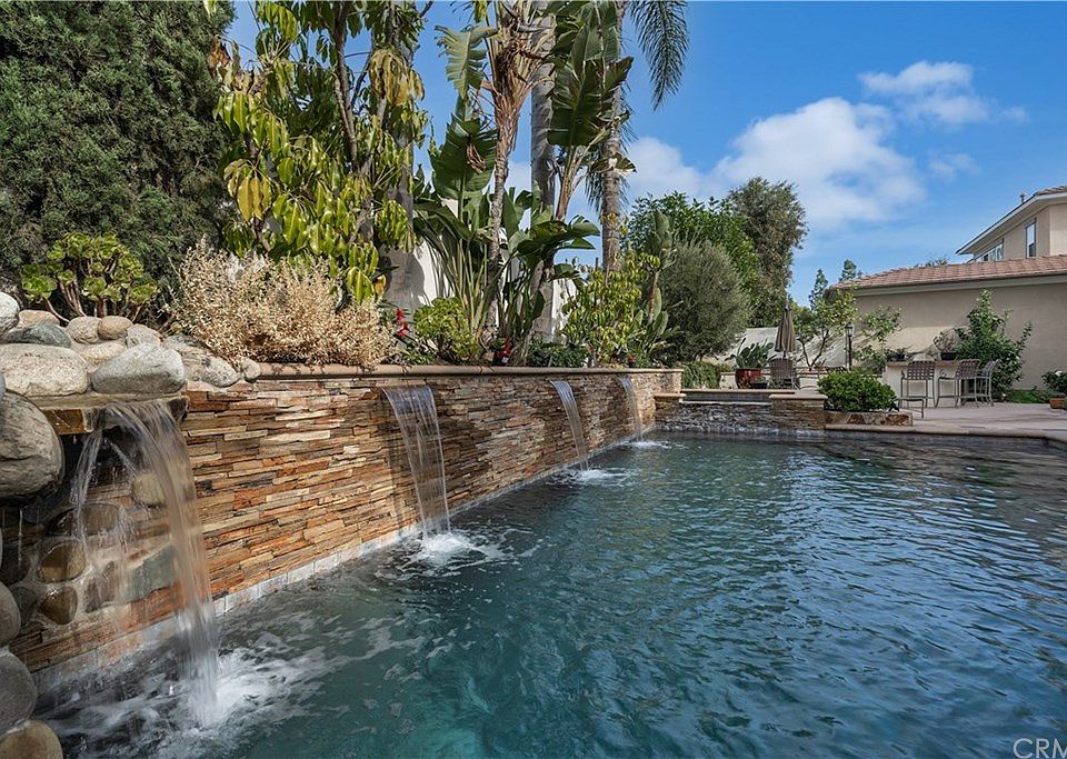 Rare and stunning pool home in the prestigious 24-hour guard gated community of Northwood Point! Nestled on a cul-de-sac street, this gorgeous Mayfield Plan is one of the most sought after due to its charming character, style and practicality! Breathtaking formal entrance with circular foyer, formal living room and formal dining room. This floorplan has 6 potential bedrooms, with TWO DOWNSTAIRS BEDROOMS and TWO DOWNSTAIRS BATHROOMS. The entertainer's kitchen is remodeled with large oversized island, crisp white cabinetry, microwave/convection oven combo, 2 ovens and opens to an oversized family room with a wall of windows looking out to your private tropical paradise! Fully hardscaped entertainer's backyard has a custom wood burning pizza oven, built-in BBQ, pool and jacuzzi with elegantly flowing waterfalls, and is beautifully enveloped in mature landscaping and outdoor lighting. Additionally features a wired home security system and video survelliance. Award winning schools (Canyon View Elementary, Sierra Vista, Northwood High) easy access to shopping & freeways, low HOA and NO MORE Mello-Roos!