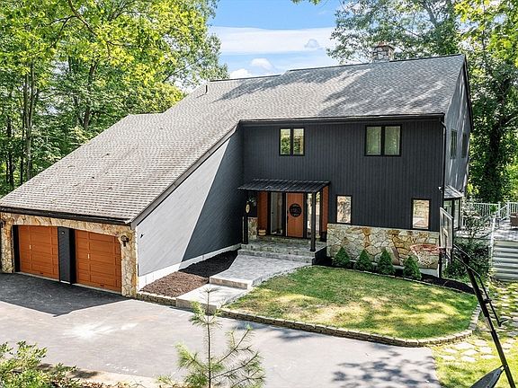 Discover this exquisite contemporary home featuring 4 bedrooms, 3.5 baths, and modern elegance throughout. Step into a stunning kitchen with stainless steel appliances, a stylish tile backsplash, spacious eat-in island, and abundant cabinetry. Enjoy the warmth of wood floors on both the first and second levels, complemented by sophisticated lighting. The expansive primary suite offers a luxurious bathroom with double vanity, custom tile shower, soaking tub, a vast walk-in closet, and a private balcony. Relish open-concept living with cathedral ceilings creating a grand ambiance on the main floor. The finished basement delights with a full bath, office, family game room, and two versatile bonus rooms. A two-car garage adds convenience, while the guest bathroom boasts a sleek tiled shower. Entertain on the wrap-around composite deck, ideal for gatherings. Nestled atop a hill in a tranquil cul-de-sac, enjoy breathtaking views and serene privacy. This home is a rare find!