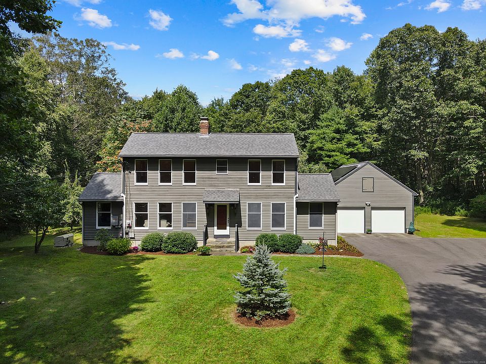 First time offered! This custom-built three-bedroom, two-bath Saltbox, privately situated on 13+ acres in Gales Ferry, offers total Southern exposure with active (solar panels) and passive energy. This home provides abundant light throughout with a galley-style kitchen and lots of pantry storage, a living room with a wood-burning fireplace, a dining room, a first-floor bedroom with a vaulted ceiling, full bath, and two identical 13x8 rooms that bookend the first floor. Upstairs are two spacious bedrooms, a full bath, and lots of closet and eave storage space. Gleaming hardwood floors throughout. Recent updates include a new roof and skylights, a new boiler, recently installed Mitsubishi mini split ductless AC (& heat) units, Sunrun solar panels, a recently installed whole-house Champion generator, freshly stained cedar siding, and a new asphalt driveway. There is also a spacious two-car detached garage with loft storage, a full walk-out basement, a central vac, a wood-burning stove, and a potting shed. All of this set on 13+ acres (possibly subdividable) in the heart of Gales Ferry yet conveniently located within minutes of Mystic, the Subase, Electric Boat, Coast Guard Academy, and major highways.