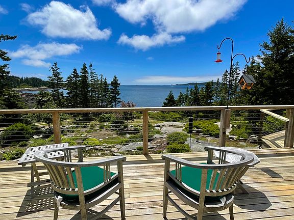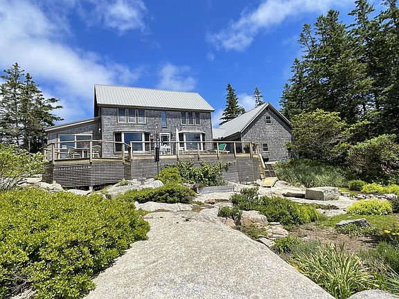 Come enjoy expansive views of Hurricane Sound from this beautifully constructed year-round home on Dyer's Island. Built in 2000 by Shelter Institute and meticulously finished off by the owners, this post and beam home has a flexible floor plan that is as comfortable for a couple as it is for a family. The first level includes an entry area, kitchen, dining room, living room with propane heat stove and office/study area, 4-season sunroom, and bath with laundry. Upstairs are two bedrooms and a shared bath. All living areas and bedrooms have ocean views. The sunroom could easily become a first floor bedroom for one level living. The house is very well insulated and has a newly installed 2023 propane hot air heating system. The 24'x30' two-car garage has running water and a workbench on the first floor. The unfinished second floor could be a beautiful art studio, recreation room or additional bedroom. (septic design allows for 3 bedroom system) Outside is a Douglas Fir deck overlooking the ocean and beautifully landscaped gardens below. The property also includes a small quarry and many gorgeous granite outcroppings. A private mooring and shared rights to a deepwater dock system on Dyer's Harbor are included.