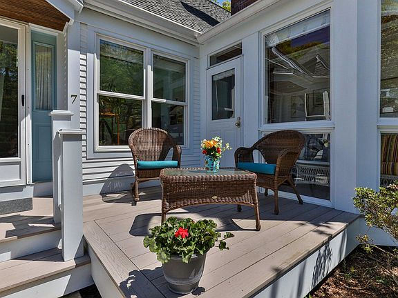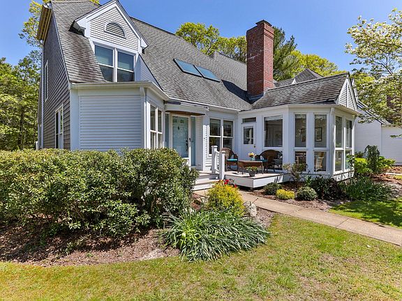 Sunny and bright! This lovely, well maintained end unit townhome is located in the highly desirable community of Windchime. Featuring hardwood floors, soaring ceilings and a wood burning fireplace, the living room leads to a 3 season room with walls of windows to take in the park-like setting. The well equipped eat-in kitchen connects to a separate dining room with pass-through for entertaining and looks out onto a private, wooded porch and patio. The spacious first floor primary with full bathroom boasts vaulted ceilings and a generous closet. Upstairs you will find a sizable second bedroom with full bathroom, three additional walk-in closets and an open loft area, which is perfect for an office space. The nicely finished basement provides flexible, additional space with an abundance of built-in shelving and laundry area. Windchime offers a community pool, clubhouse and tennis/pickleball courts while proximity to the shops and restaurants of fabulous Mashpee Commons and the salty shores of South Cape Beach make this an A+ location. Perfect for either year round living or your new Summer getaway!