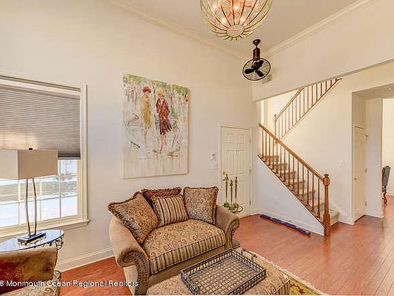 Premium location, convenient to the Clubhouse, open plan 2,400 sf Exeter (largest model) 3BR/2.5b features gas fireplace, hardwood floors, granite & stainless steel kitchen, main floor living room, family room, den, formal dining, master suite, powder room and laundry. Upstairs 2BR, full bath and large loft area is great for guests. Enjoy tennis, pool, gym, and community activities a short ride from the beach and Ocean Twp. golf and parks.