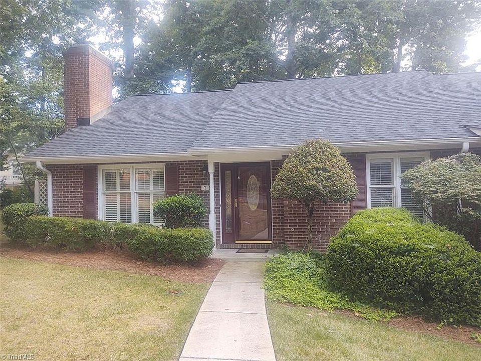1 story all brick, end unit 2 bed/2 bath townhouse next to A&Y (biking/running/walking) Greenway (paved) trail & Guilford Military Park. HVAC (2022) & hot water heater (2022). Crown Molding & Plantation Shutters in entire house. Hardwood floors in living & dining rooms, both bedrooms, hall & entry. Tile in kitchen & eat in breakfast area. Living room w/fireplace & built in book shelves & open to dining room w/bay window. Kitchen w/granite counter tops & all stainless steel appliances & attached overhead microwave & tumbled backsplash & pantry. Kitchen opens to 32' x 12' deck & 6' x 6' exterior storage room. Overhead lights/fans in living room & both bedrooms. Primary bedroom w/full en-suite w/double vanity & granite counter tops & walk-in closet. Large backyard w/privacy fence between units. Laundry room w/storage. Easy access to 840, I-40, I-85, & Battleground Ave. Near shopping, restaurants, running/walking/biking trails, Guilford military park, GSO science center, & Country Park.