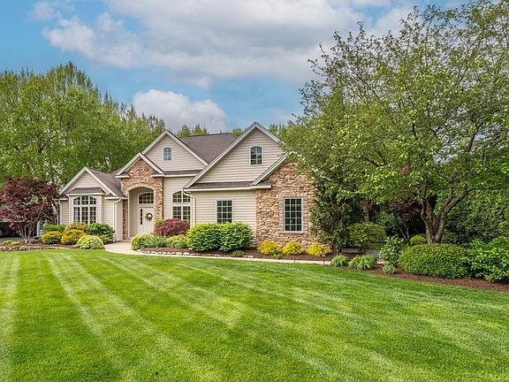 Welcome to this spectacular CUSTOM BUILT RANCH-style home nestled on a meticulously manicured "park like" lot at end of peaceful cul-de-sac in desirable Munger Hill! This exceptional property offers a perfect blend of elegance, comfort, & functional living spaces! Eat-In Granite Kitchen w/Stainless Appliances & Breakfast Bar, Bright & Inviting Living Room w/Fireplace & stunning Window Wall w/Transom Windows, Outdoor Oasis includes a beautifully maintained Koi Fish Pond, Expansive Stone Patio, Decorative Exterior Lighting, Irrigation System, Shed & Fenced Private Yard, Luxurious Primary Suite boasts Tray Ceiling, his & her Walk-in Closets, Soaking tub & Walk-in Shower, Finished Basement includes spacious Family Room w/Dry Bar, 2nd floor Guest ensuite w/Full Bath & large unfinished attic area ready for customization to add extra living space. Throughout the home, you'll find custom built-ins, exquisite millwork, crown moldings & soaring ceilings adding elegance & character to every room!