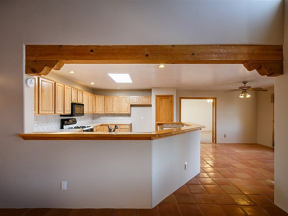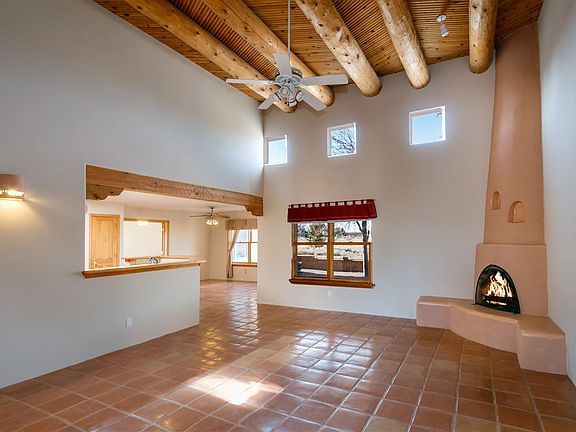 Spacious and bright with wide open floorplan and uncommonly high viga ceilings. Large media room/playroom/office with it's own private patio and kiva fireplace. Master has double sinks, his and hers walk in closets, spa tub and stand up shower. Three outdoor living areas with foothill and mountain views. In-floor natural gas radiant heat, deep 3-car garage with workshop space. Good bedroom separation. Beautiful Saltillo tile floors and new carpet in the bedrooms. Pretty front walled courtyard with perennial garden all on a drip. Shared well - No water bill! Stuccoed shed conveys. NO STEPS.