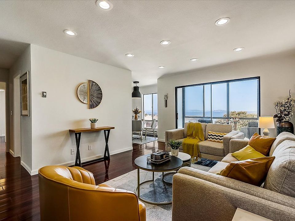 Rare corner penthouse with a forever stunning ocean view! The spacious 2B/1.5B condo features include large windows which bring lots of natural light into the home; updated flooring throughout; dome light ceiling in the living room. Open floor plan, ideally for entertaining in the living room, enjoying the ocean view in the huge, private balcony, and exploring new recipes in the modern finished kitchen. Ample closet space, one assigned garage parking, 24-hour onsite security. Have fun in the gas heated pool, hot tub, tennis courts and other community provided facilities. Easy access to 580/80, walking distance to Watergate Market, The Eville Public Market, Trader Joe's. 9/10 K-8 Charter school. Do not miss this opportunity!