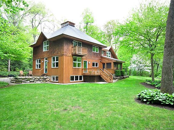 Architecturally Imaginative. Solid bone structure and gorgeously conceived with an architects pencil and a designers eye. Every best-in-class material has been meticulously maintained since the owner commissioned the home in 1998. Evoking a relaxing vacation retreat with a cedar shake exterior, matching deck and outdoor shower. Nine-foot ceilings, soaring, custom 4-ganged Marvin windows and an open floor plan, blur the boundaries and contribute to a sense of relaxation and well-being. The kitchen, dining room and family room flow effortlessly into one another and are anchored by a stunning, field stone fireplace. With almost an acre of privacy, the back yard is your own private park, with raised bed perennial gardens ringed in field stone and a fire pit. There are multiple outdoor seating areas. A favorite is the 17x11 screened-in porch with soaring cathedral ceilings and doors leading to the kitchen and the cedar deck. A field stone patio, accessible off the living room, delivers a natural circular flow between these thoughtful spaces contributing to great parties. Adding to your hosting quotient, a wired stereo closet for sound throughout the home. The lower level, bathed in sunlight with high ceilings, is perfect for an office or playroom. Car enthusiasts will appreciate the oversized, two-car garage with fully insulated custom flooring. Set back on a quiet wooded street, in a charming town, boasting CTs top schools, this home is simply exquisite.