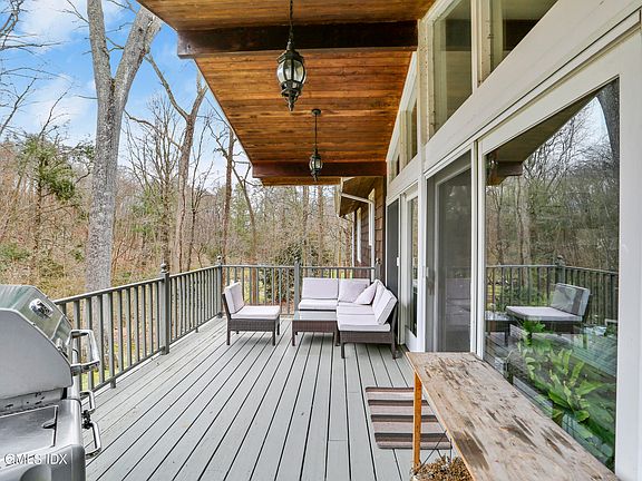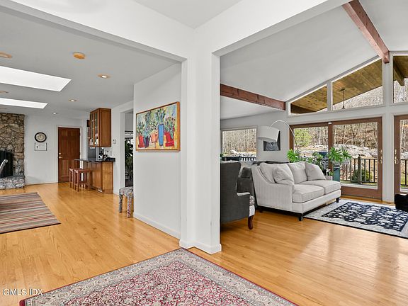 Inviting, 5-bedroom Mid-century Modern home enveloped by natural beauty providing 1.93 private acres with entertaining deck, patios and level backyard on cul-de-sac in super convenient location very close to town, train, shops and schools. Sundrenched main level boasts beautiful open floor plan with oversized windows, sky lights and hard wood floors. Expansive living room with fireplace, floor to ceiling windows and French doors leading out onto large deck and huge flat yard.; dining room with wet bar open to kitchen with breakfast bar. Also on this level the primary suite with updated ensuite bath with shower and soaking bath, as well as two further bedrooms and hall bath. Lower level features large family room with big windows, fireplace and screened-in porch; 2 bedrooms, one with own entrance, great for guests/au-pair; full bath and laundry complete the lower level. With attached and detached garages.