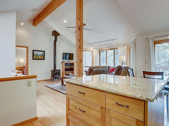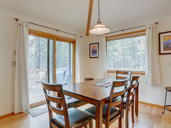 Experience the rustic charm and luxurious amenities of 7 Cedar, nestled in a quiet cul-de-sac in Sunriver. This inviting retreat offers tranquility in a wooded setting while keeping you close to city attractions like Fort Rock and the SHARC. Enjoy the comfort of a private hot tub and air conditioning in this bright and spacious home, reminiscent of a log cabin with its beautiful wood paneling, vaulted ceilings, and natural wood columns. Step inside to find a cozy living space with a fine leather sofa, plush armchairs, and a wood-burning stove. The open-concept floor plan connects the living room to a dining area with a large table for six. The kitchen boasts granite countertops, a central island with additional seating, and high-end appliances, perfect for any traveling chef. The upper level features a bedroom with a king-size bed and a hall bathroom, while downstairs offers a second bedroom with a queen bed and a third bedroom with double twin bunks. A wrap-around porch with a BBQ grill and comfortable patio furniture enhances the outdoor experience. Guests can enjoy eight unlimited aquatic center passes during their stay. The single-car garage is ideal for storing outdoor adventure gear and ensuring your vehicle is safely stowed away. Located in Sunriver, 7 Cedar provides easy access to local hot spots and natural beauty. The home includes a collection of adult and kids' bikes, perfect for exploring nearby trails and enjoying the fresh air. A separate rental agreement will need to be electronically signed before your stay. The home has air conditioning and will feature a brand new hot tub as of June 2020.