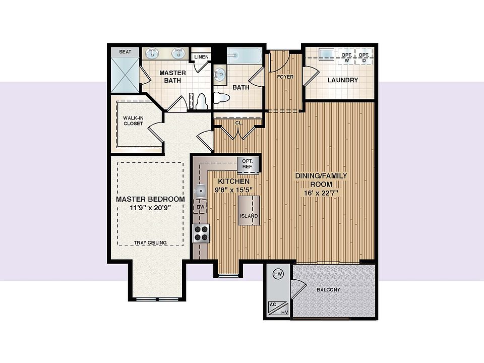 The Granville 1 highlights one amazing master bedroom, 2 baths and 1,222 square feet of living space. Enjoy an open dining/family room, kitchen with center island, balcony and more.