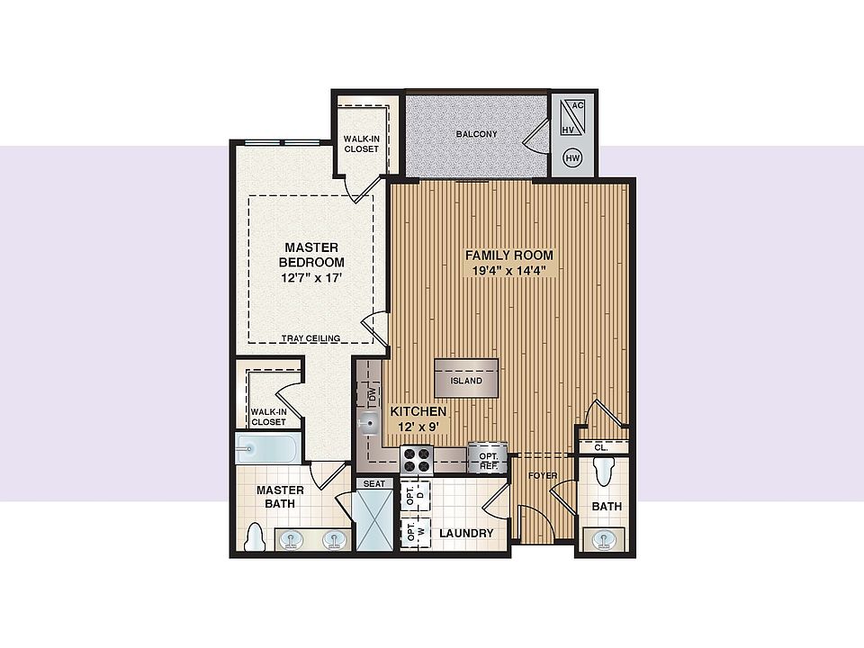 The Anson 1 offers one bedroom, one-and-a-half baths and 1,017 square feet of living space. The beautiful master bedroom features two walk-in closets and a private master bath.