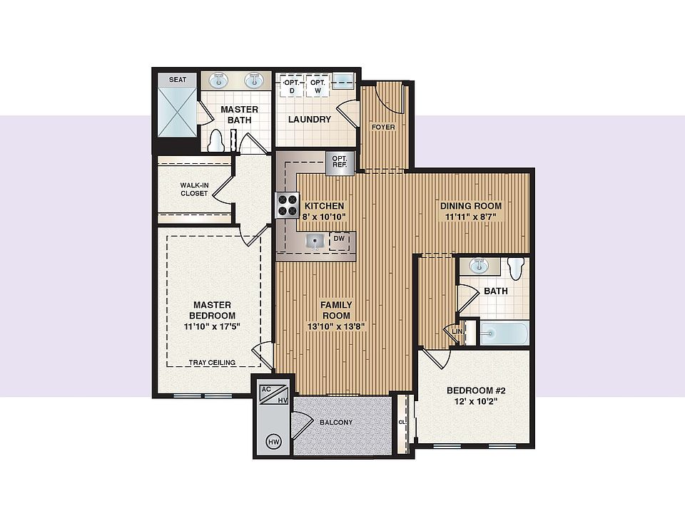 The Cromwell 1 features two bedrooms, two baths and 1,188 square feet of living space. Perfect for entertaining, the floorplan highlights a great family room that leads into a dining room and kitchen.