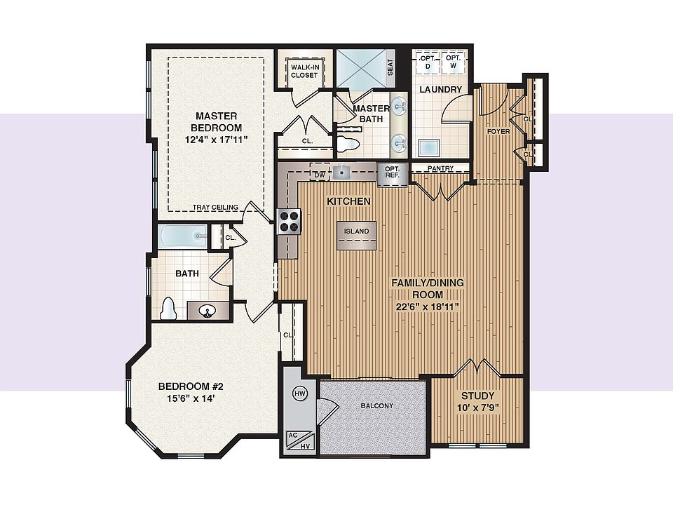 The Drummond 2C features two beautiful bedrooms, two baths and 1,481 square feet of living space. The kitchen with center island leads into a spacious family/dining room, balcony and study.