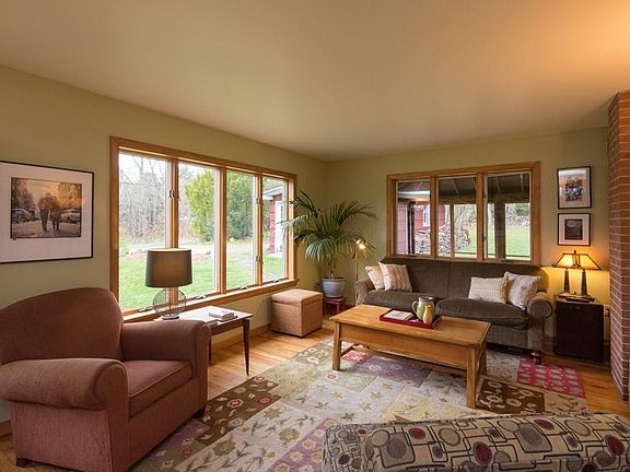 Contemporary Ranch with STYLE. This 2186 sq. ft single story home is sited on a lovely open lot in a convenient Worthington location with easy access to 112 and 143. There are 3 bedrooms, 2 full baths, a bonus room in the attic, ideal for a playroom or a supplemental bedroom. The kitchen with a chef's stove is open to the dining area with fireplace and multitudes of windows that allow for views to the outside and natural light to stream in. There are two wood stoves that supplement the heating costs. Dramatic family room with vaulted ceilings is currently used as the master bedroom with an attached office. Wood and tile floors throughout. Great mudroom with laundry plus a newly remodeled full bath. One of the bedrooms has a loft that is a kid's dream. Screened porch off the side of the house, stone walls, raised bed gardens, minutes to a nearby CSA farm and the Audubon Sanctuary down the road. Come to beautiful Worthington!