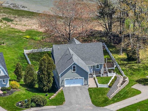 SPRUCE CREEK WATERFRONT HOME offers direct water frontage with breath taking views. Nestled among quality homes on a private cul-de-sac, this home is sited at the Cottages at Spruce Creek in desirable Kittery, Maine. Enjoy panoramic tidal views and 1000’ of shared water access with a private neighborhood dock from this custom-built home and all the amenities any discerning buyer would expect. Open concept floor plan is perfect for entertaining and allows for aging in place. Large dining area, granite kitchen counters, vaulted ceilings and a gas fireplace, plus a separate office area compliment the sun-drenched rooms. Primary bedroom shares the double-sided fireplace and has its own deck with a sunken hot tub overlooking the tidal waterfront. Primary bathroom has zero-entry step into a custom tiled shower, double sinks and heated floors. The 2nd level offers two guest bedrooms with generous-sized closets, a full bathroom, and access to a 500+/- sq. foot unfinished bonus room over the garage Finished lower level has the benefit of a separate entrance, heat and A/C, and a wet bar and pantry, laundry and full bath. Maintenance-free siding, trim and fence. Shopping, dining, outdoor recreation and major road access are all nearby. Portsmouth, NH, is only a 5-minute drive & Boston is 60-miles. Whether you’re enjoying a beautiful sunset or launching your kayak off the dock, this property is not just a home; it’s a retreat that promises a life of tranquility.