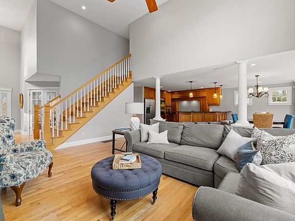 Charming modern colonial offers a timeless, elegant setting to gather with friends and family. Make treasured memories snuggled 'round the two-story fireplace, seated at the encircling kitchen countertop, relaxing on the expansive patio, roasting marshmallows at the firepit, reading on the covered front porch, curled up on 2 large window seats, or tucked into one of 4 large bedrooms! Need some me time: slip into the private main floor home office/den. Gourmet kitchen boasts granite countertops, custom cabinets, stainless appliances, Jenn Air gas range with indoor grill, and counter seating for 6! Soaring ceilings, 2 ensuite bedrooms, gleaming hardwood floors, spa-like baths, and 2nd floor laundry. Plus new full-house generator, central vac, mud room and outdoor shower for sandy toes from nearby Sandy Neck. This sun-filled Hall Custom Homes stunner is nestled on a cozy cul de sac in Great Hills, with all that Sandwich and Cape Cod living offer. Come see coastal living at its finest.