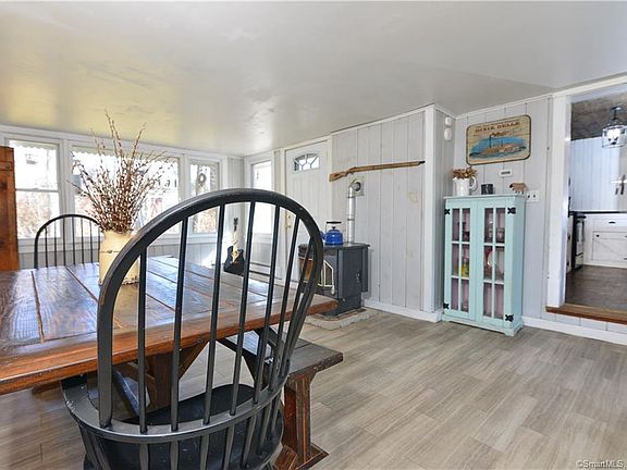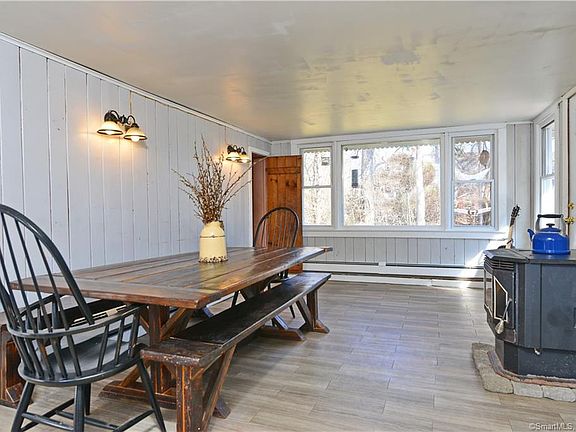 Sellers are motivated - will work with buyers -Charming Country Cape with quick access to 395. Welcoming Farmers porch and Deck Large Family Room/Dining Room has cozy pellet stove. with access to private Deck. Updated Eat-in kitchen with Stainless Steel appliances, New vinyl plank flooring. Full Bath off Kitchen with old fashioned tub & shower, new plank tile flooring. Front parlor has Harwood floors, with pellet Stove and Sunny windows with rustic country shutters.2 and half tons of pellets to convey with sale. 1st floor bed with 1/2 bath. 2 car garage has been made into a nice 1st floor Master Bed with walk in closets has door to storage area near front garage doors. 2nd floor has 2 Beds. Oil Furnace & hot water tank, New chimney insert, Vinyl siding, replacement windows, there is a seasonal babbling brook to enjoy in the back yard. Public Water & Sewer. New Solar Panels in 2019 leased $179. /month. must convey with property. laundry hook ups in back bedroom & front porch. No washer & dryer to convey. rooms freshly painted. Large Shed. Minutes to Mass line, 30 minutes to Worcester & Providence. Enjoy great Putnam restaurants & shopping.back on due to inspections. Being sold AS IS Buyer must take solar lease over