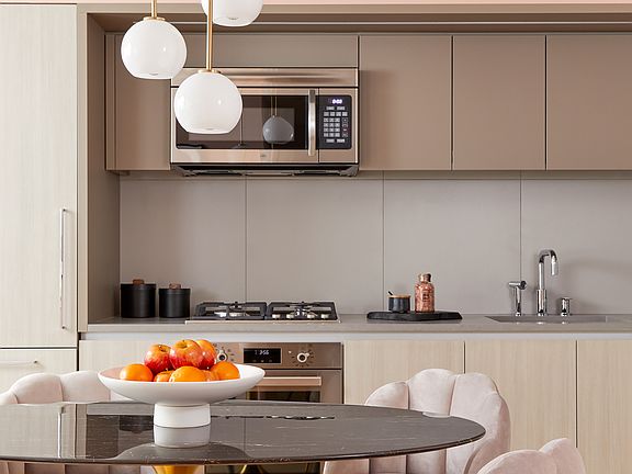 Residences boast custom kitchens, framed in warm wood capped with sleek quartz countertops, and seamlessly integrated Bosch appliances blend with impeccable millwork and counter-to-cabinet porcelain backsplashes, balancing perfect functionality with pure elegance.