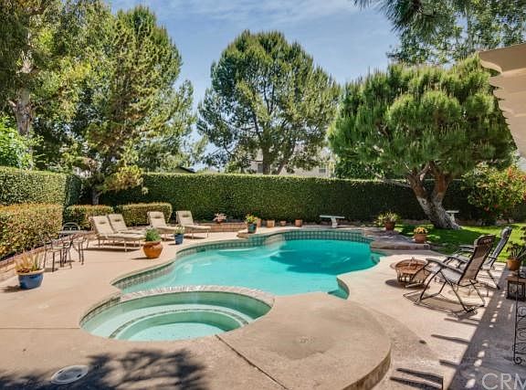 An entertainer's dream! Enjoy the California lifestyle with your own private pool and spa in this rare, large yard with serene natural setting backing to the beautifully landscaped Venta Spur Trail. Whether sunning on the large view deck overlooking the pool and trail or relaxing in the shade beneath, the tranquility of the setting is striking. This well designed 4 bedroom, 2.75 bath executive home with over 2700 sq. ft. features a formal living room with soaring ceiling; formal dining room with built-in hutch; remodeled gourmet kitchen with granite counters and stainless appliances including a roomy eating nook that overlooks the spacious family room with cozy fireplace and wet bar; secluded downstairs bedroom and upgraded bath; and a laundry room. The upper level offers a luxurious master suite with sitting room that features a fireplace and a master bath that includes both a soaking tub and a shower. Additional amenities include new dual paned windows and doors with etched glass; custom front doors; recessed lighting; concrete tile roof and more. Well located a few steps from Northwood Community Park! No HOA or Mello Roos!