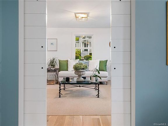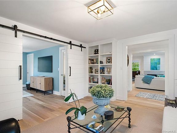 This completely renovated 4BR colonial sits tucked away and high atop Drum Road, yet 2 blocks from beach, town dock and Rowayton Seafood Restaurant...location, location, location. The interior glistens with all new finishes, fixtures and design details such as an open floorplan, shiplap, barn doors, designer lighting and plenty of room to spread out. Primary bedroom has skylights, seasonal water views, featuring gorgeous sunrises, sparkly and spacious en suite bath with oversized shower and soaking tub and light filled study with back staircase featuring white oak and cable rails. Fully walk out lower level that leads to a professionally landscaped private yard, features a family room with 2nd fireplace, eat in area, half bath, additional laundry room and plenty of storage. Large patio and fenced in yard offer privacy for entertaining and room for the dog and all to play!