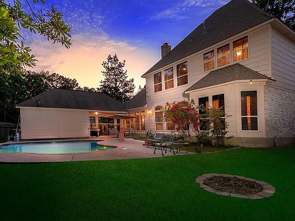 Centrally located and move-in ready home that backs to a lush greenbelt in Panther Creek! Located on a cul-de-sac street, this home features soaring ceilings, extensive tile flooring, crown moulding, abundant windows, all new ducts for A/C and heat, refinished chimney interior, new flashing & more! Island kitchen with Corian counters, Thermador appliances including induction cooktop, warming drawer, double oven and fridge, plenty of cabinet storage and counter space opens to sunny breakfast nook; den with gas log fireplace; both formals; private study; master retreat down has amazing bath with brand new shower with Lux stone and tempered non-stain treated glass, and new free standing tub; 3 bedrooms and game room up; fenced yard has beautiful pool and room to play and entertain!