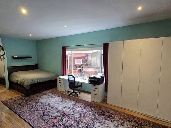 A large, studio bedroom with an attached, recently renovated private bathroom. The bathroom features a vanity with ample storage, radiant floor heating, a jacuzzi bathtub, a rainfall showerhead, and a handheld shower wand, along with a floor-to-ceiling linen closet for additional storage. The bedroom offers a bright, open layout with a large window that brings in plenty of natural light, plus blackout shades and blackout curtains. A chalkboard wall provides a functional space for notes, planning, goal setting or brainstorming. Additional features include an original (non-functional) fireplace, a wall-mounted TV, and access to a Shark robot vacuum during the lease. Storage is well thought out, with a mirrored-door closet and extra overhead cabinets above the closet. The shared living space includes the living and dining room, kitchen, laundry, and the gym located in the garage. No security deposit required. First and last month's rent due upon moving in. No smoking allowed indoors. 6-month lease with the possibility to extend. Pets welcome.