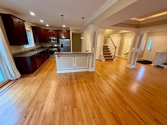 No brokerage fee! Tucked away on a quiet dead-end street, this stunning newer-construction townhouse offers over 2,500 square feet of thoughtfully designed living space. The open-concept main level features soaring 9-foot ceilings, custom inlay hardwood floors, a striking tray ceiling above the raised gas fireplace with bluestone hearth, and central A/C ideal for entertaining in style and comfort. The gourmet kitchen boasts custom cabinetry, a granite two-tiered island, and stainless steel appliances.