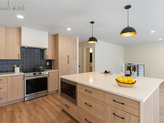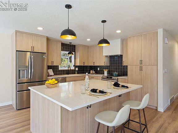 This gorgeous, completely renovated 5-bedroom, 3-bathroom home is perfectly located within walking distance of Garden of the Gods. The open floor plan showcases a beautifully designed kitchen with custom cabinetry, quartz countertops, a stylish tile backsplash, and a large center island with counter seating, making it ideal for both cooking and entertaining. The primary suite is a private retreat featuring two closets and a spa-like bathroom with an oversized shower and double sink vanity. Enjoy breathtaking mountain views from the front deck, perfect for morning coffee or evening sunsets. The terraced backyard deck provides an ideal space for barbecues and outdoor gatherings. A rare combination of modern elegance, prime location, and stunning scenery, this home is a must-see.