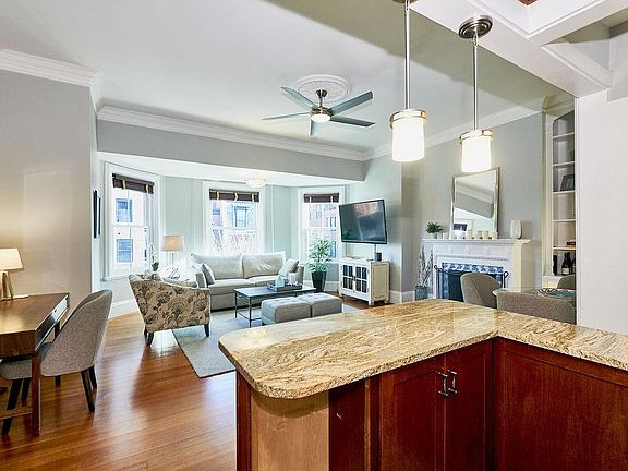 OPEN HOUSES POSTPONED!!!! Sophisticated, spacious and bright! This gorgeous floor-through home in the heart of Back Bay offers an open floor plan with designer details. Beautiful hardwood floors throughout, brand new high-efficiency ALL WOOD Harvey windows with screens, high ceilings, two bay windows, built-in shelving, crown molding and two decorative fireplaces create elegant charm and character. The kitchen boasts custom wood cabinets, stainless steel appliances, tiled backsplash and contemporary pendant and undermount lighting. The oversized master bedroom with a fireplace and bay window creates a tranquil retreat. The tiled bathroom comes complete with radiant floor heating and walk-in steam shower. A generous second bedroom, great storage and in-unit laundry complete this ideal Back Bay home. Building is pet-friendly and perfectly situated between Commonwealth Ave and Marlborough St.
