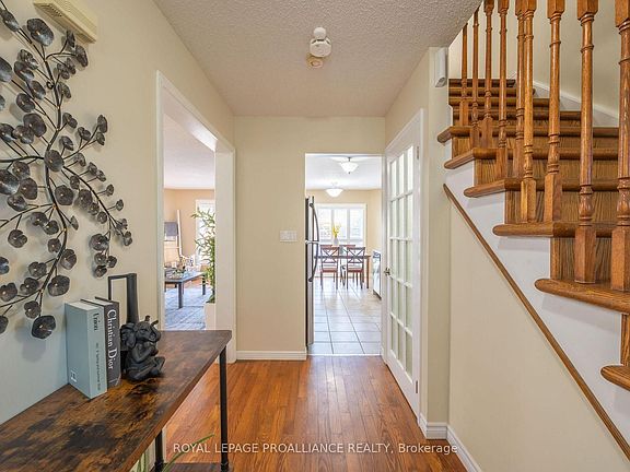 Welcome to this picture-perfect all-brick home in the heart of Courtice, where timeless charm meets modern comfort. Follow the elegant stamped concrete walkway to the welcoming covered porch - a lovely spot to watch the world go by. Inside, sunlight dances across rich hardwood floors that flow seamlessly through both levels, leading you to a stylish updated kitchen adorned with gleaming stone counters, stainless steel appliances, and a tiled backsplash, with a sun-soaked south-facing eating area that walks out to the deck. Step outside to a private, fully fenced yard - your own peaceful retreat for morning coffees or starlit gatherings. A convenient powder room and direct inside entry to the garage round out the main level. Upstairs, three inviting hardwood floored bedrooms and a family bath with Corian counter offer space and serenity, while the partially finished basement extends the living area with a spacious rec room and abundant storage. Thoughtful upgrades include smart light switches and door locks, 200-amp service with wiring for an EV charger, new furnace and upgraded attic insulation (2021), upper rear windows replaced (2021), and roof shingles (2023). Simply move in and enjoy!