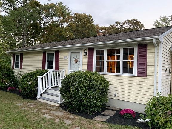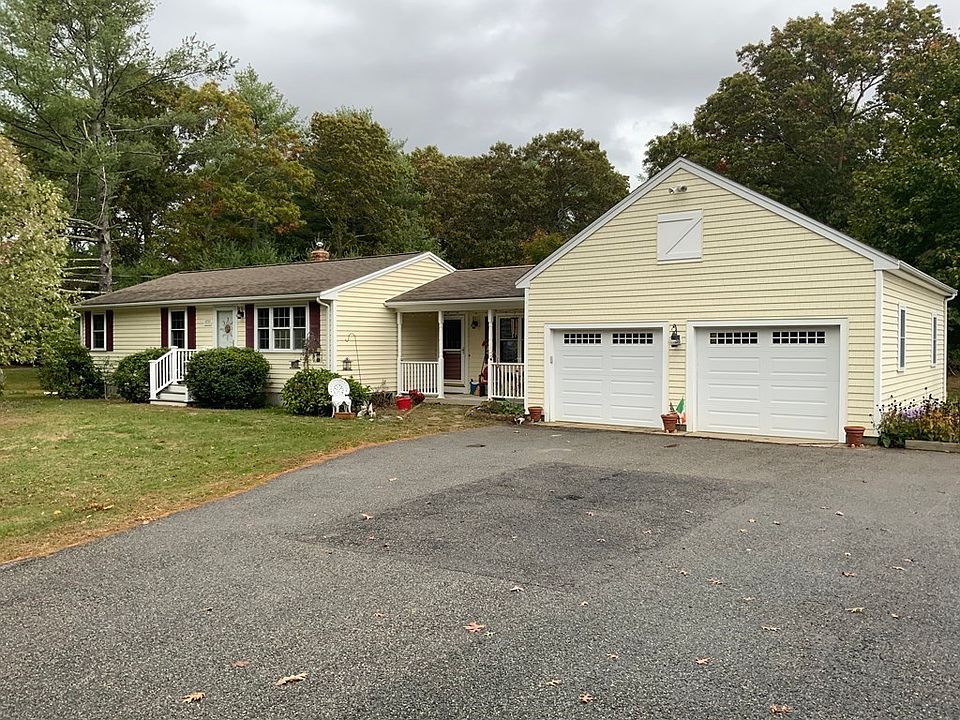 Welcome to Berkley! This beautiful one level ranch is set back on a lovely, one acre level lot that abuts town conservation land. A long paved driveway leads to an oversized 24' x 30' 720 square foot garage with three overhead doors and a lofted level for extra storage! A covered porch entrance leads to an open family room with cathedral ceilings. Patio doors open to a sun drenched room with windows spanning the entire wall and a slider to the back deck. Continue into the cozy eat in kitchen. There are oak cabinets, ceramic tiled flooring, and brand new granite counters! The front room can be used either as a living room or dining room. There are two bedrooms and a third small room which is currently being used as a walk in closet but would make a great nursery or child's room. There is a full unfinished basement where you will find the laundry hook ups and a three year old pellet stove which can be used to heat the whole house. Move in and enjoy.