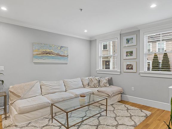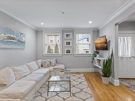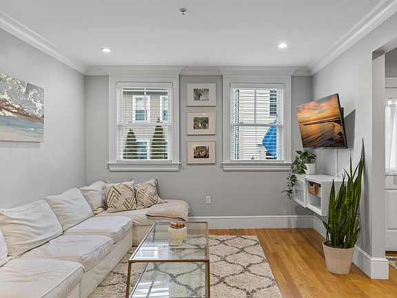 Presenting 7 Franklin St Unit #1 - Glistening hardwood floors sprawl through this spacious, sun-filled 2 bedroom, 2 bathroom unit. At the front of the home, a private entry gives way to a large foyer with a laundry closet and storage. The open concept living room boasts oversized windows, classic crown molding, and flows into the dining/kitchen space. A custom chef's kitchen offers a stainless steel Electrolux package complete w/ gas stove, timeless white quartz countertops, soft-close cabinetry and an island fit for 3. The primary suite offers a lush en-suite bathroom w/ double vanity, walk-in closet, and an oversized glass shower stall. The second bedroom is equally spacious and equipped with a sizable closet and large windows. Owners can take in the city views from their deeded roof deck. Central air, deeded oversized storage room in basement. Ideally located just off of Main Street with access to all that Charlestown has to offer!