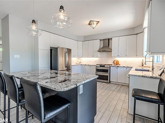 DESIGNER FINISHES, FAMILY-SIZED SPACE, BACKING ONTO A PARK WITH A BACKYARD BUILT TO WOW! Think executive-style living, exceptional finishes, a spacious interior, and a backyard haven with a deck, wood gazebo, hot tub, and no direct rear neighbours backing onto a park - this one has it all! Located in the sought-after Mountaincroft neighbourhood of Collingwood, this beautifully maintained home backs directly onto Mountaincroft Park and playground, offering a family-friendly setting. Enjoy four-season living with Blue Mountain Resort, Georgian Bay, beaches, golf, hiking, Scandinave Spa, and downtown shops and dining just minutes away. Designed with coastal flair, the home features a gabled roofline, a blue exterior, a double garage with an inside entry, manicured gardens, a covered front porch, and double front doors with a transom window above. Built in 2015, the property offers over 2,100 sq ft of space, featuring cohesive finishes, modern lighting, and stylish decor. The living room features a gas fireplace, custom-built-ins, a TV niche, display shelving, accent lighting, and oversized windows. The showstopping kitchen presents white shaker cabinets, granite counters, a subway tile backsplash, stainless steel appliances, including a gas stove, an oversized island with seating, and a double-garden door walkout. A defined dining area adds warmth with board-and-batten detailing and statement lighting. Appreciate the convenience of main floor laundry, complete with storage cabinets and a sink. Upstairs, the generous primary suite features a walk-in closet, a board and batten feature wall, a sitting area, and a luxurious 5-pc ensuite with a dual vanity, soaker tub, and a large glass-walled shower. Three additional bedrooms are tastefully decorated and share an oversized 5-pc bathroom. The fenced, landscaped backyard is the ultimate escape with a hot tub, wood gazebo, gas BBQ hook-up, and a large deck. Rarely offered and impossible to forget - make it your #HomeToStay!