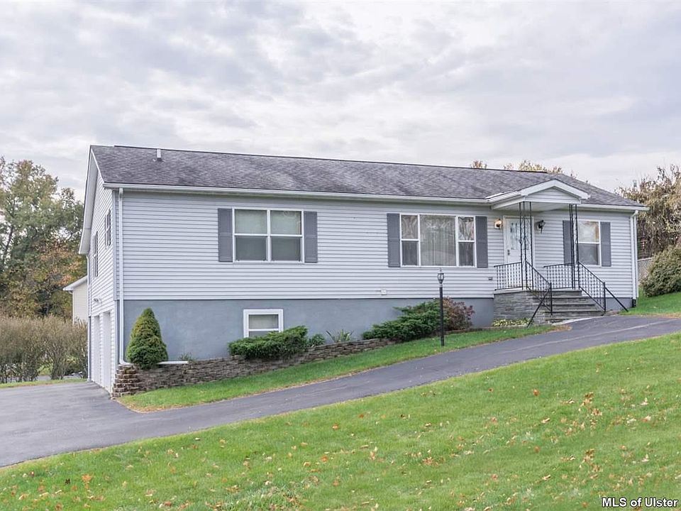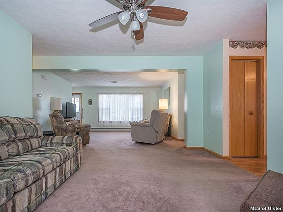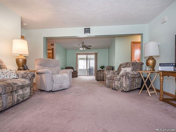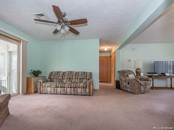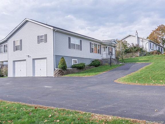 All on one floor. Original owner home is ready for you! Nice floor plan with Living Room open to formal Dining Room with sliding door to a large windowed enclosed porch. Master Bedroom Suite is in one side and the other 2 bedrooms are on the other side with a full bath. Huge kitchen, has laminate flooring, big pantry, double sink, small computer space, enclosed washer/dryer with access to the carpeted enclosed porch and out to the open patio to side back yard .HWH is 3 year old. New A/C compressor. Present owner is on budget for $225/month, (Central Hudson). 780 sq. ft. basement with high ceilings has its own thermostat ,high ceiling and half bath, ready to finish for extra living space. Oversized garage with side door to the covered patio. Walking distance to Crosby and Miller schools. Minutes to Uptown, malls, and NYSThruway.