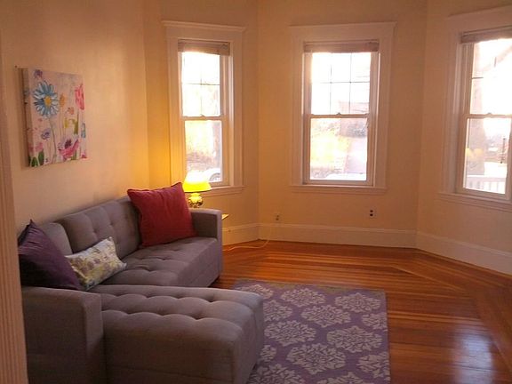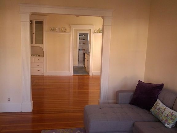 Charming, well maintained, spacious and clean apartment in superb West Medford location, just steps to commuter rail, Bistro 5, Playstead Park, but on a quiet tree lined side street! LESS THAN 15 MINUTES to Boston via Express Bus #326 to Haymarket or via Commuter Rail to North Station!! Updated kitchen with pantry, gas stove, dishwasher, and disposal. Dining room with china cabinet and bay windows, roomy living room, two bedrooms, and spacious foyer that offers option for office or playroom. Exclusive use washer/dryer and plenty of storage in basement. Two car parking; one space is in garage. Gas heat, replacement windows, and insulated walls will keep heating bills reasonable. Shared yard, private front porch, shared back deck. No smoking. Pets negotiable. Available July 15th. Apartment will be freshly painted prior to occupancy.