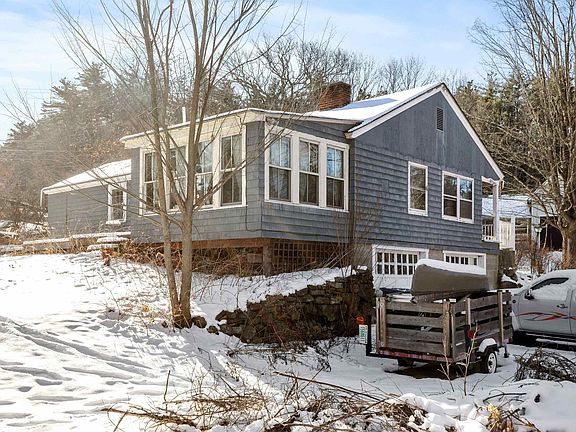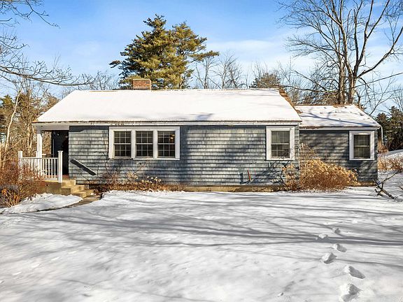 Charming 1950s Bow Ranch with 2 Bedrooms & 2 Bath on .59 acres is located within easy access to 93 & 89, Bow Town Offices, Sargent's Field Park & close to Concord town line. Natural Gas, Town Sewer on Road (Property currently has Private Septic/Leach field). New Forced Hot Water Gas Boiler. Floor plan provided for layout and room sizes. Living room w/ wood fireplace, dining area with built-in hutch, kitchen with stainless steel appliances and built-in wall pantry & counter seating in kitchen. Sunroom can be used multiple ways with french doors to deck. Down the hall you'll find an updated bathroom with 3/4 tiled shower, and first bedroom. Pull down access attic storage located in hallway. Primary Bedroom with vaulted ceiling, two closets and full updated bathroom. Basement has washer/dryer hook-ups, 2 garage bays with great storage and basement vented gas stove. Plenty of paved parking area, grassy yard, hot tub concrete pad and wiring in place. Separate shed in backyard has great storage. Offer deadline: Monday, Jan 29th at 5pm.
