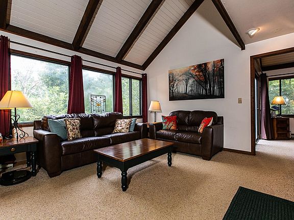 Charismatic Ridgetopper tucked in the trees of a heavily wooded 0.71 acre lot near the end of the cul-de-sac. Main floor features open kitchen, dining area, access to rear deck, large living room with vaulted ceiling and woodburning fireplace. You'll also find the spacious master bedroom with high ceilings and full private bathroom and the second bedroom for the guests with access to full bath. Upper level loft/family room is accessible via the spiral staircase is roomy and has an overlook to living room below. Laundry is located in lower level. Rear deck wraps around the house and provides an excellent space to take in the sights and sounds of nature in your own personal wooded setting. Property is being sold furnished with furnishings to be transferred on a separate bill of sale. Call today to schedule your personal tour!