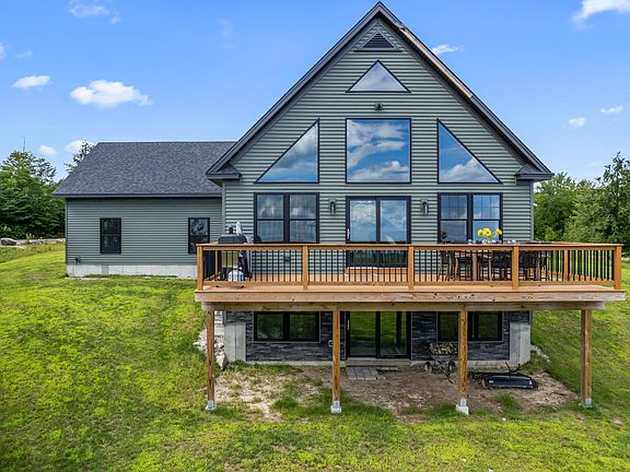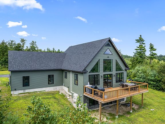 Spectacular Sebago Lake views! This stunning contemporary home with Maine-inspired design & a beautiful setting is situated on a 3.2 acre private lot with a gentle slope and wooded surroundings. The exterior includes a large well-landscaped yard, a stone patio, a spacious paved driveway, & a firepit that overlooks Sebago Lake.