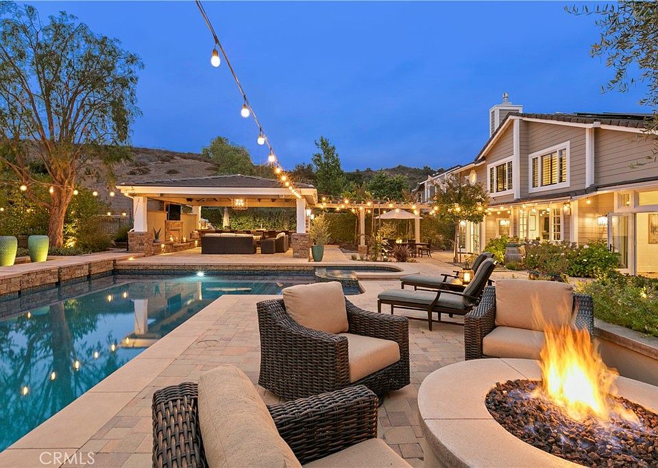 Set on an expansive 11,050 sq ft lot with no rear neighbors, this 3,421 sq ft home includes a 517 sq ft covered entertainer’s patio. The backyard is designed for elevated living, complete with a heated gunite saltwater pool and spa, tranquil water features, sauna, fire pit, and chef-style outdoor kitchen with pizza oven, BBQ, beer fridge, warming drawer, and refrigerator. Lush landscaping including mature fruit trees, grapevines and hillside views create a peaceful backdrop, with a chandelier, outdoor fireplace, speakers, lighting, and a mounted TV for all-season enjoyment.